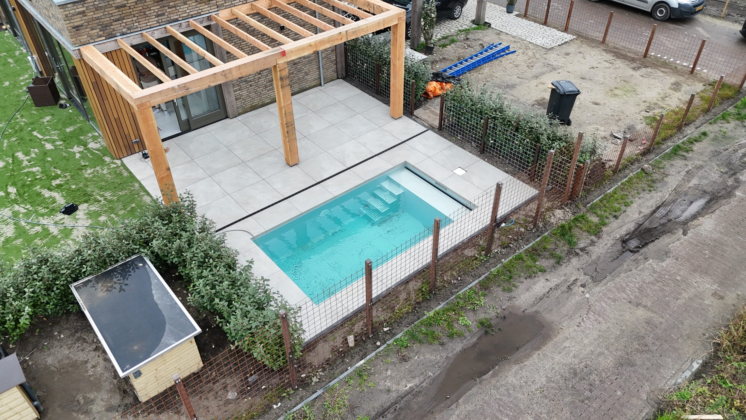 Op de uitgegraven ondergrond is een betonvloer gestort die volledig voldoet aan de technische eisen en specificaties voor zwembaden. Deze vloer vormt een stabiele en duurzame basis voor het bad. Het HDPE-zwembad, dat speciaal op maat is gemaakt, is daarna met precisie geplaatst. Door rekening te houden met het lijnenspel van de woning is het zwembad perfect afgestemd op het ontwerp en de architectuur van het huis, waardoor er een harmonieus totaalbeeld is ontstaan.
