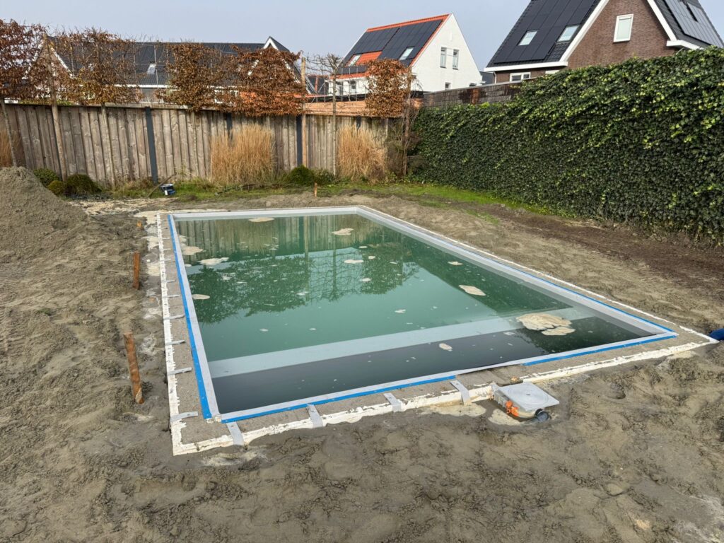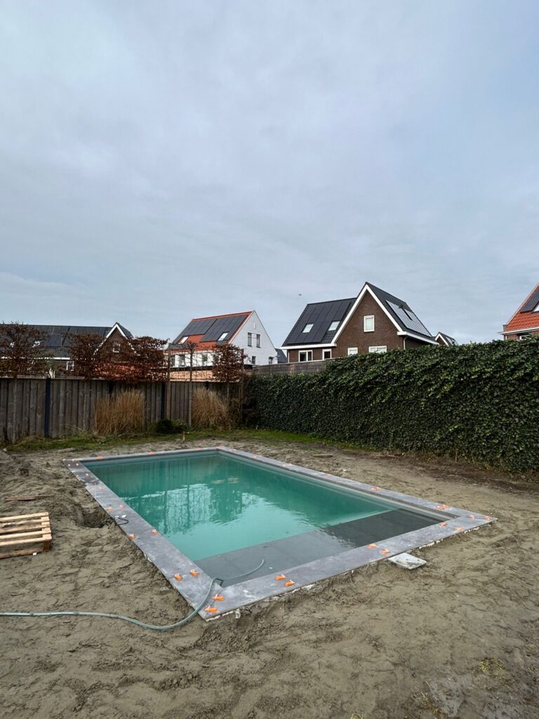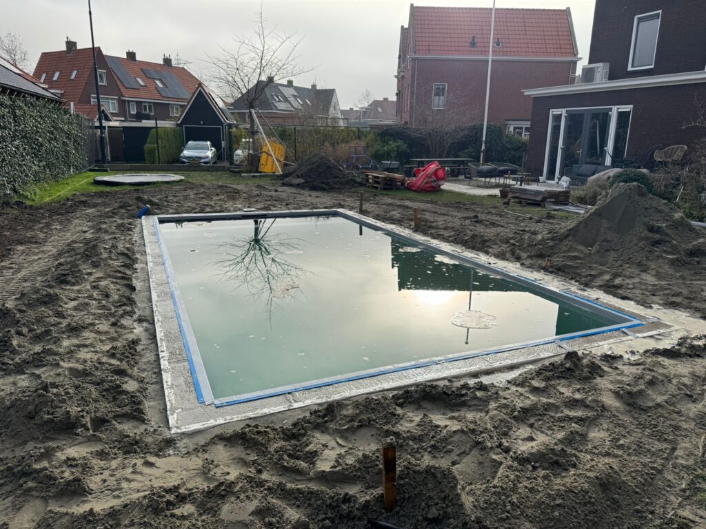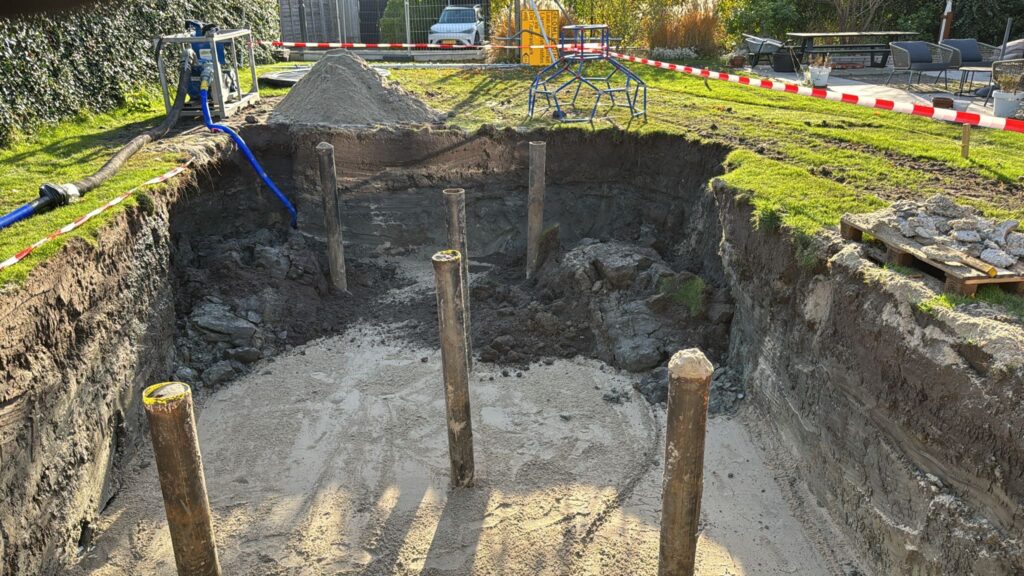 Een bouwkundig zwembad begint altijd met een stevige ondergrond. In Middelburg bleek de bodem minder stabiel, waardoor heipalen noodzakelijk waren. Deze palen zorgen ervoor dat het zwembad jarenlang stabiel blijft en vrij is van verzakkingen. Bovendien dragen ze bij aan een optimale waterdichtheid en duurzaamheid.