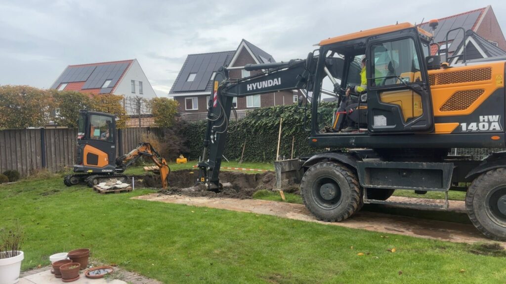 Daarna volgde het uitgraven van de bouwput, inclusief het zorgvuldig afvoeren van de grond. Dit gebeurt met precisie, zodat de exacte maatvoering van 700 x 350 cm wordt bereikt. Een nauwkeurige uitgraving is essentieel om later problemen te voorkomen.
