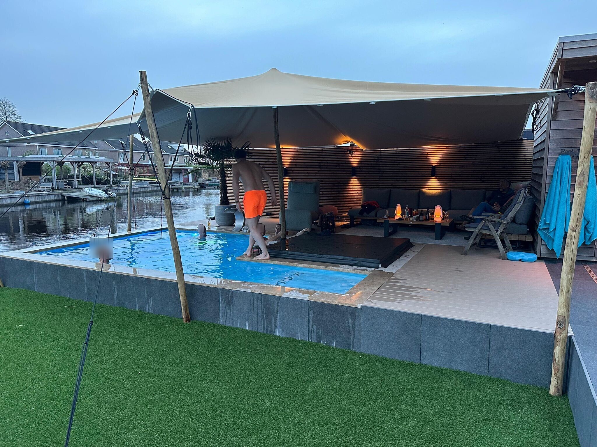 Het project begon met het slaan van heipalen die dienden als stevige fundering voor zowel het zwembad als het aangrenzende terras. Deze fundering is essentieel voor de stabiliteit en duurzaamheid van het geheel. Vervolgens werd de bouwplaats zorgvuldig uitgegraven zodat er voldoende ruimte ontstond voor zowel het zwembad als de spa. Uniek aan dit project was dat alle grondwerkzaamheden vanaf het water zijn uitgevoerd met behulp van een schip, wat de uitvoering extra bijzonder maakte.